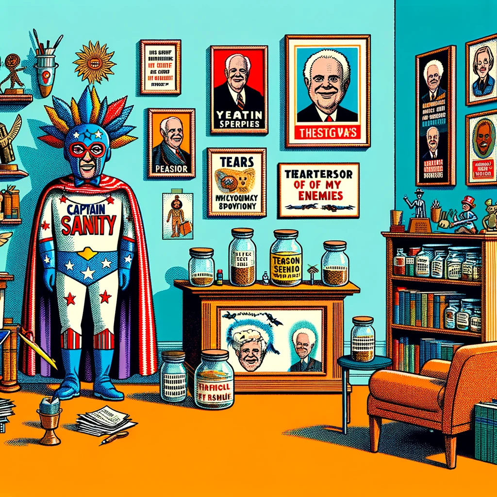 You can’t help but notice the life-sized cardboard cutout of your therapist in a superhero costume labeled “Captain Sanity” standing proudly in the corner. Oh, and let’s not forget the collection of jars labeled “Tears of My Enemies” on the shelf behind their desk. You start to question if you’re the one who needs help or if this is some twisted episode of “Hoarders: Therapy Edition.”