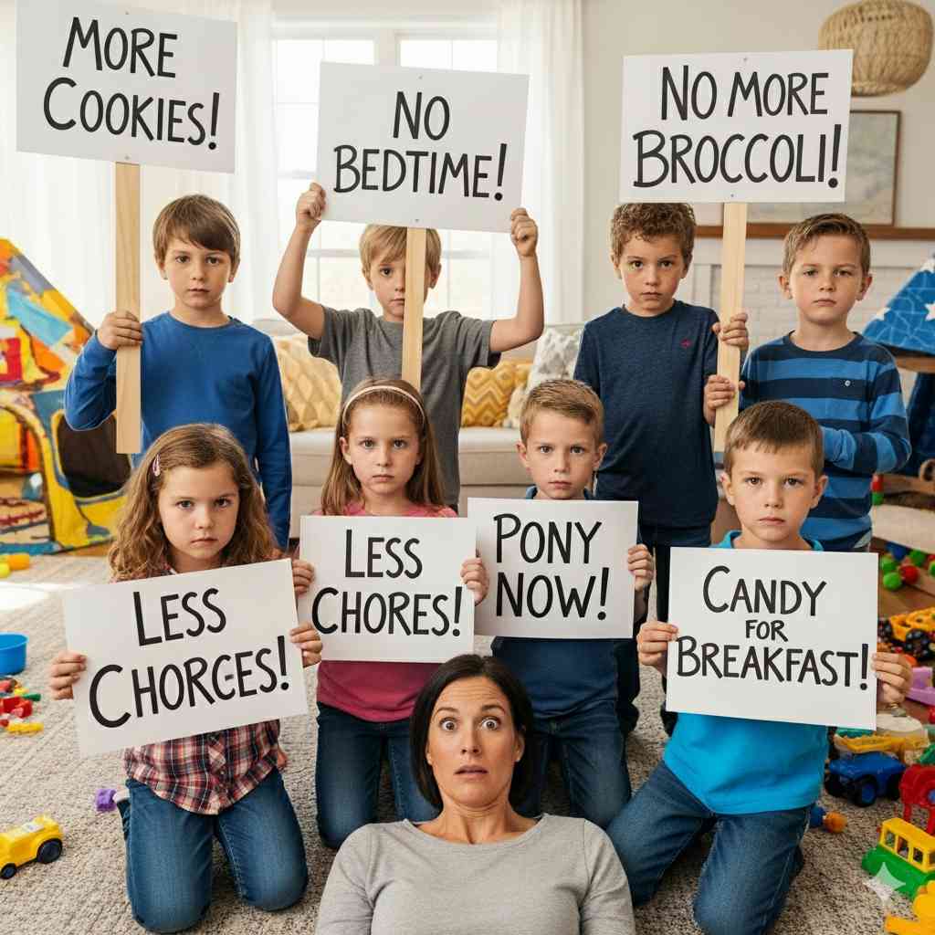 Your eight-year-old has created a PowerPoint. There are pie charts about unfair dessert distribution. The baby is recording everything for “legal purposes” (translation: drooling on your phone). You’re not the parent anymore – you’re management, and management is losing. Bad.