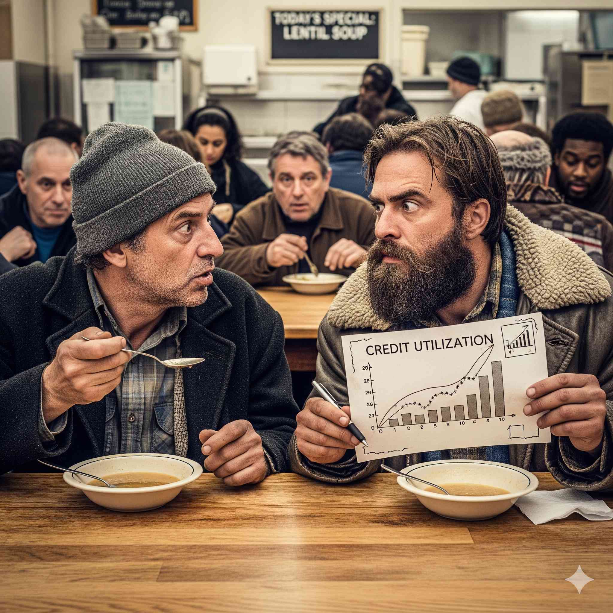 You know what nobody talks about at the soup kitchen? Credit utilization ratios.