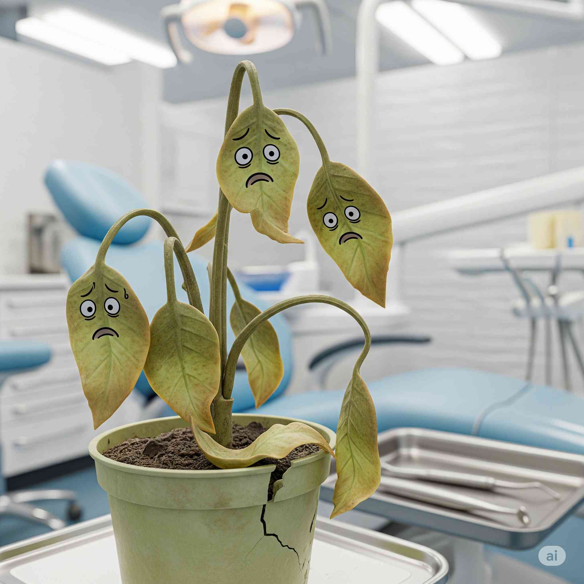 The décor is… specific. There’s a painting of a smiling tooth, except the smile has too many teeth in it. Like, way too many. The plant in the corner is plastic, obviously, because nothing organic survives here. But—and this is the weird part—the plastic plant is dying. How does plastic die? Why does it look scared?