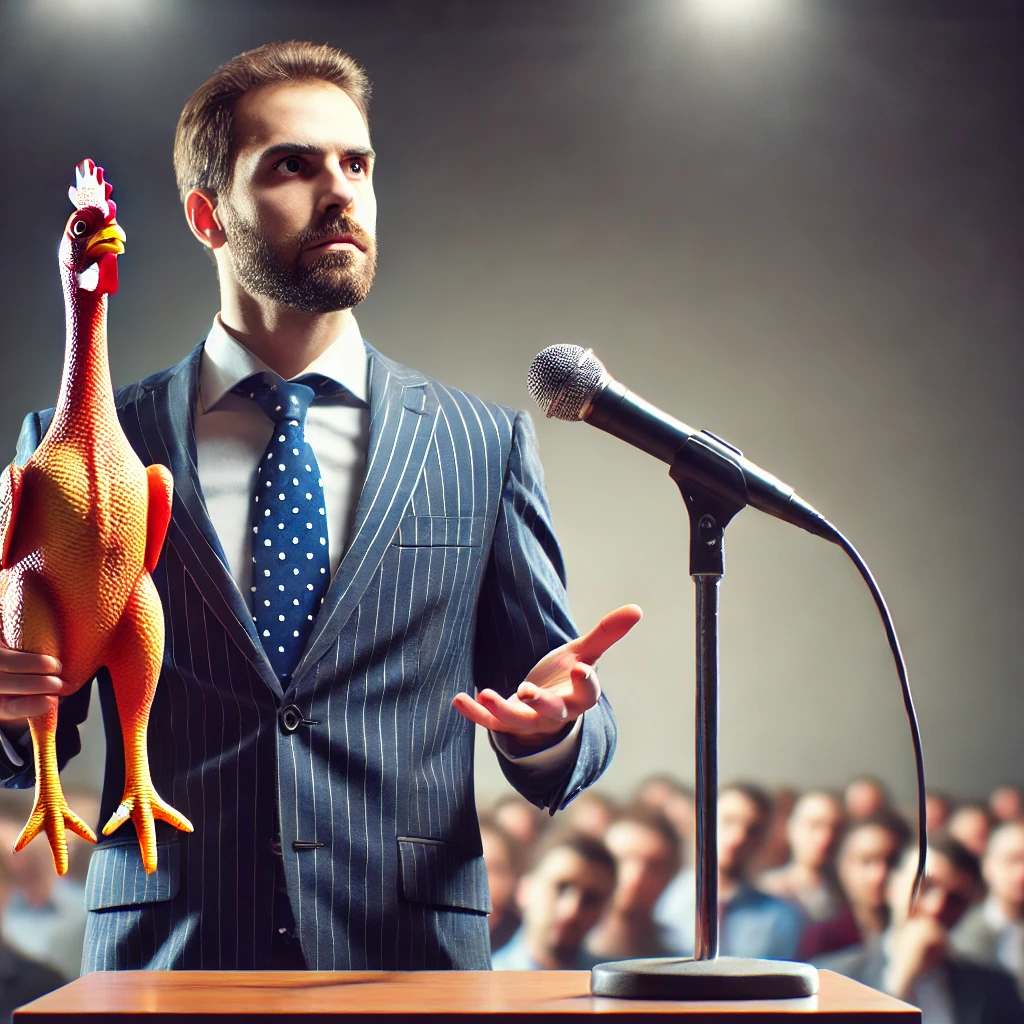 If your speech starts going off the rails, pull out a rubber chicken. Squeeze it. The ridiculous noise will jolt people awake, and they’ll forget that you were struggling to remember your next point. Rubber chickens are the ultimate distraction—nobody can ignore a grown adult squeaking one in public.
