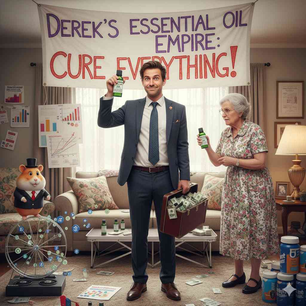 You know Derek. Everyone’s got a Derek. He’s the family member who shows up to Christmas dinner with a briefcase full of samples and a PowerPoint presentation about how tea tree oil can solve world hunger. This time he’s peddling essential oils that apparently cure everything from athlete’s foot to existential dread.