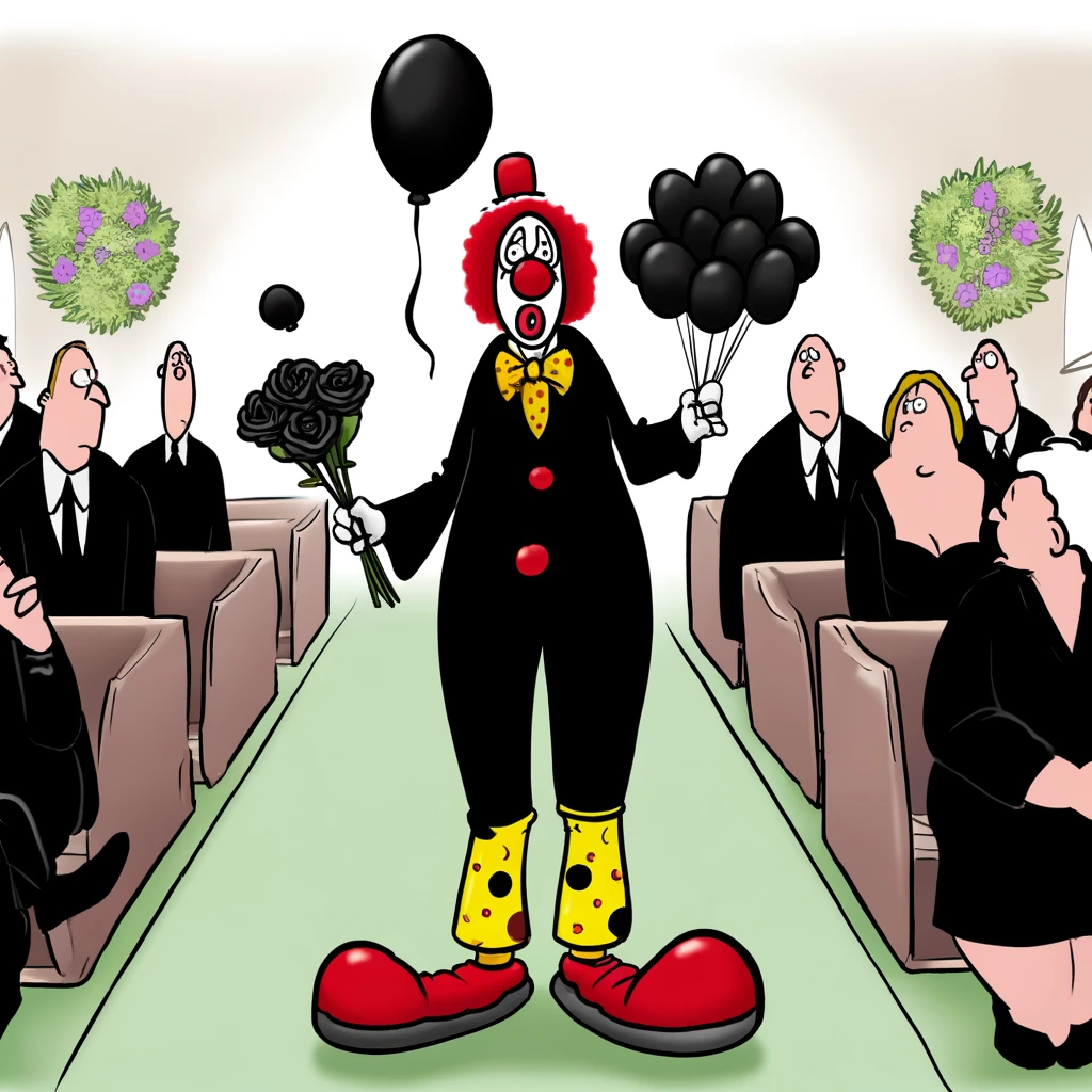 Funeral clowns are an underappreciated tradition. Dress up as a clown, complete with a red nose and oversized shoes, and show up to the service. Stand at the back, juggling black roses and blowing up black balloon animals.