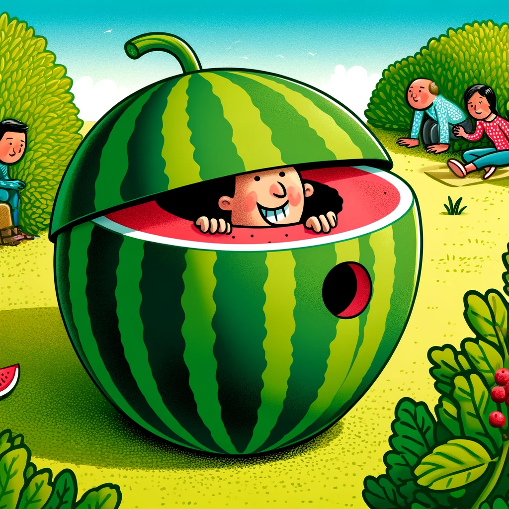 - Climb inside the watermelon and replace the cut-out piece. Voila! You’re now a human-sized watermelon seed.