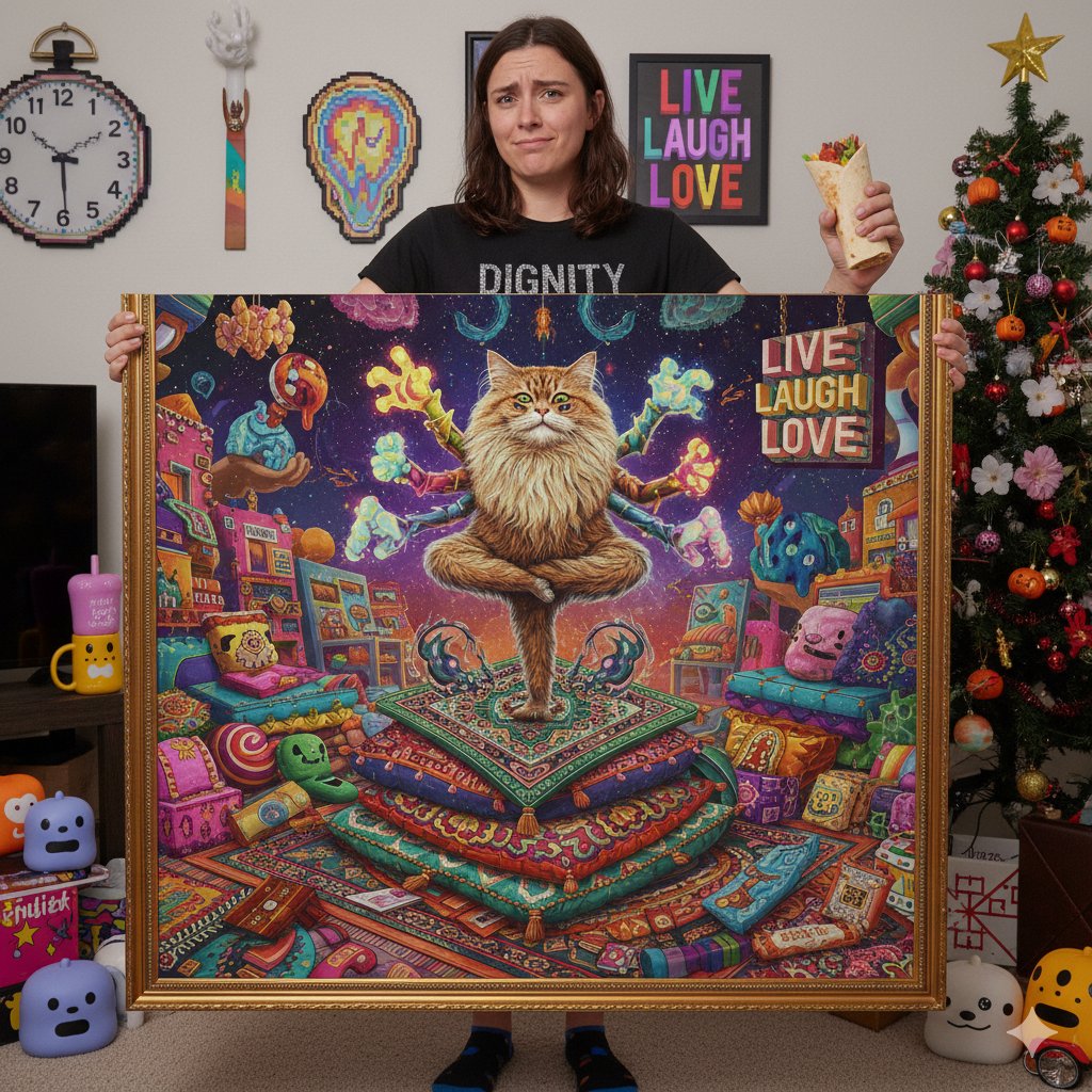 They’re not buying excellence. They’re buying the idea of creativity at a price point that doesn’t require thinking too hard. Your three-legged cat doing yoga? Someone’s going to print that out and put it in their cubicle. And every day, they’re going to look at it and feel something.