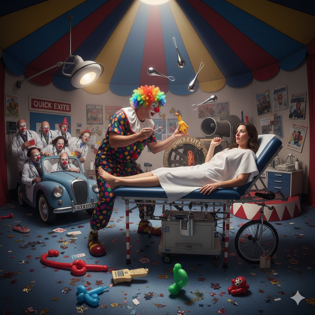 Even that serious-looking doctor at the university hospital—you know, the one with all the degrees? Yeah, well, one of those degrees is from Clown College. It’s right there between Harvard Medical and their certification in “Advanced Juggling for Pelvic Exams.”