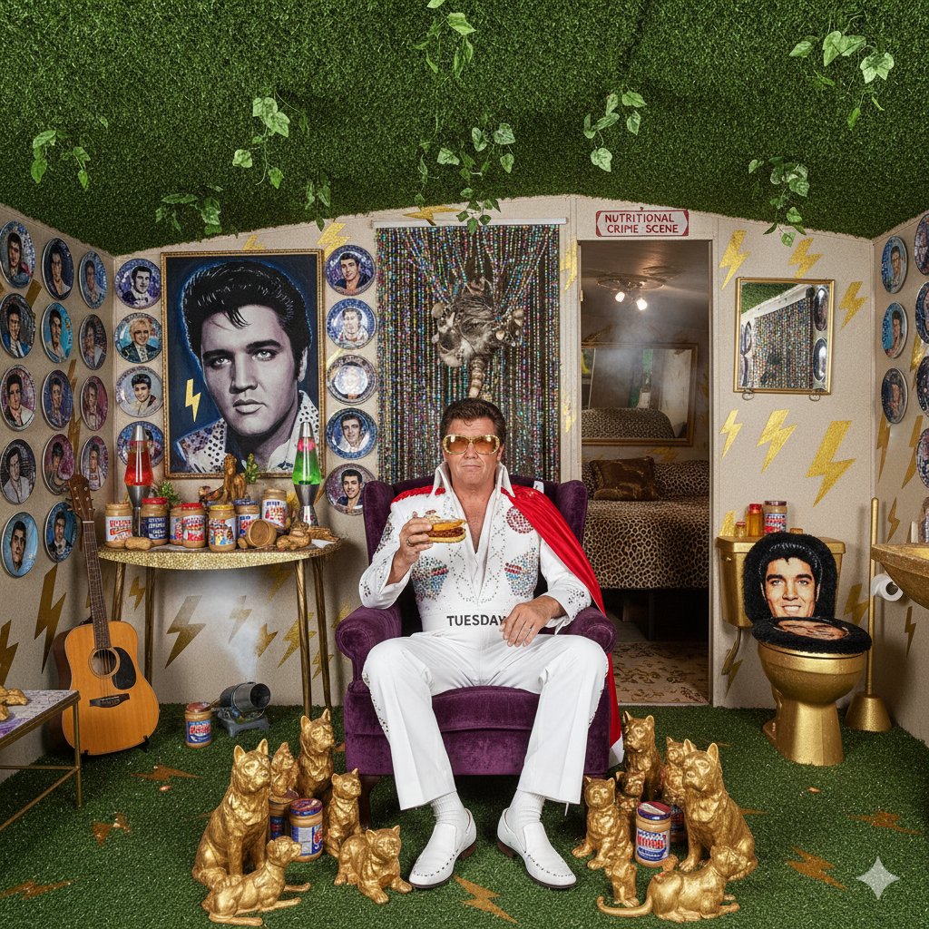 But when you’re sitting in your jungle room at 3 AM, surrounded by ceramic hound dogs, eating your fourteenth fried banana sandwich of the day, wearing a cape because it’s Tuesday and Tuesday demands capes – you’ll know you’re living your truth.