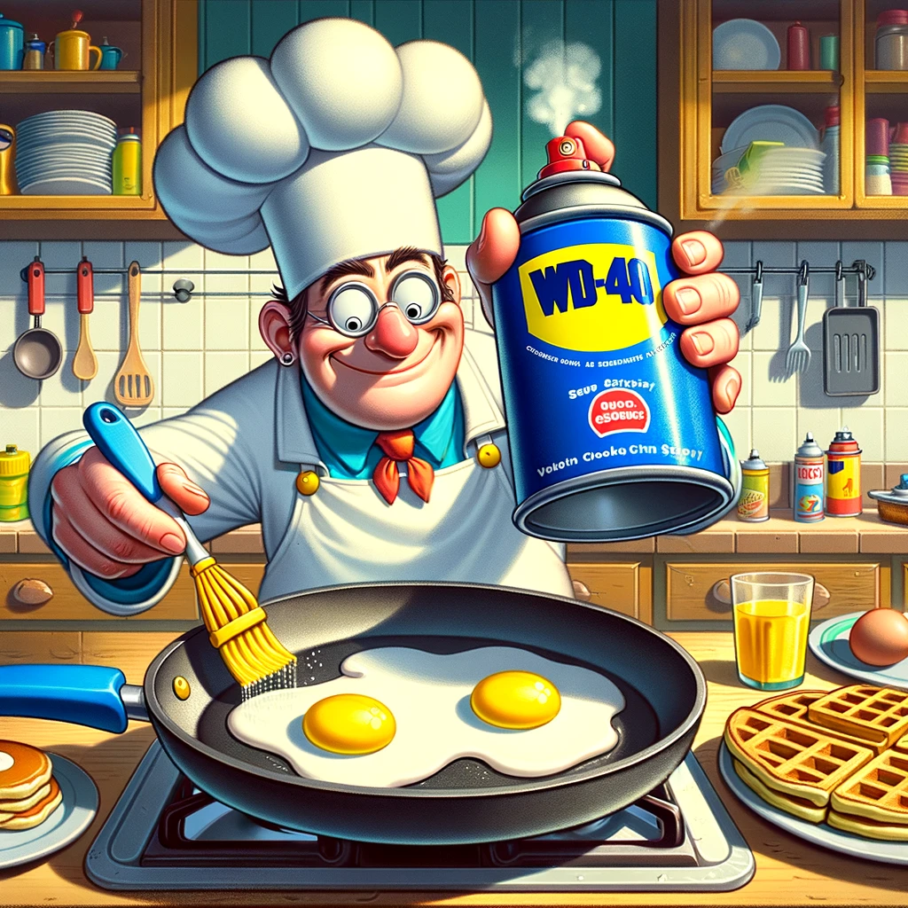 Tired of your eggs sticking to the pan like a clingy ex? Want to flip pancakes with the grace and finesse of a Cirque du Soleil performer? Look no further than WD-40! Simply coat your frying pan with a generous spritz of this magical lubricant, and watch as your breakfast glides across the surface like a greased-up Olympic luge team.