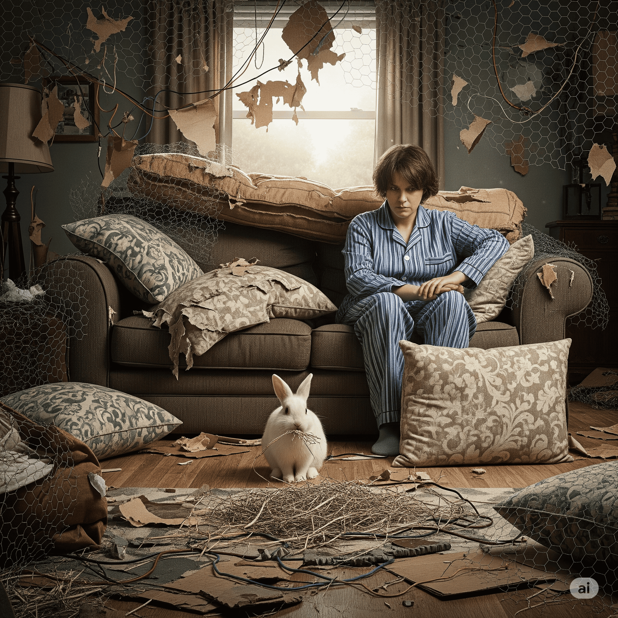 Your new aesthetic is “post-apocalyptic rabbit fortress.” Every surface needs protection. Every cable needs armor. That minimalist vibe you were going for? Dead. Your home is now 70% chicken wire and bitter apple spray.